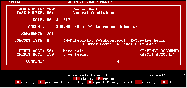If you are not using TACT’s inventory module and wish to charge the value of items used from inventory to a job, you would enter a jobcost adjustment. If materials were left over on a job and therefore stored for future use, you would also want to do a jobcost adjustment.