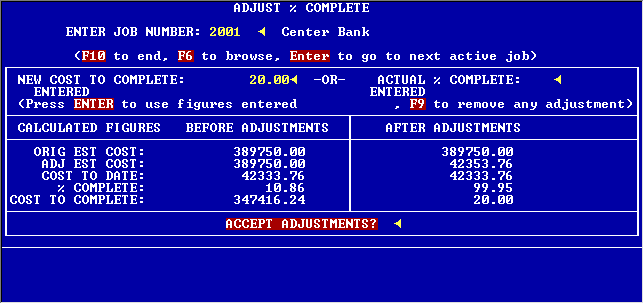 You can adjust the figures on the WIP report by changing either the % Complete or the Cost to Complete. This changes affect only the WIP report and do not change the actual information on the job in the system.