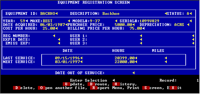 This screen is used to set up a piece of equipment. You can enter the last service date, hours or miles and when you want to next service the equipment. The system will then warn you when it is time to service this piece of equipment. When you enter a service transaction, the last service date, hours or miles are automatically updated.