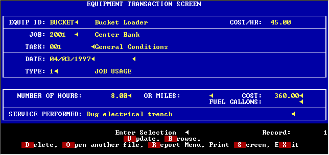 You would enter equipment activity each time a piece of equipment is serviced, used on a job, rented out, fueled up or any other reason. This would then provide a history of everything that has ever happened to this piece of equipment.