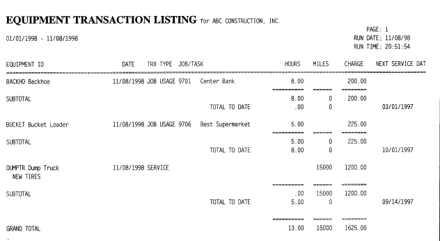 This selection allows you to print all the activity for each piece of equipment between two dates in detail or summary format.