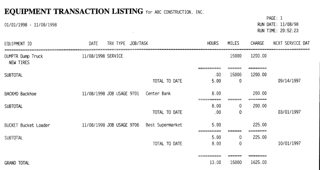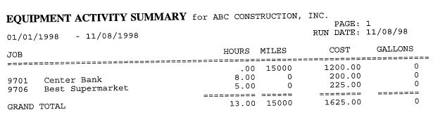 This selection allows you to print any equipment activity for a job in either detail or summary format.