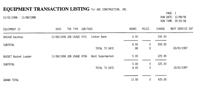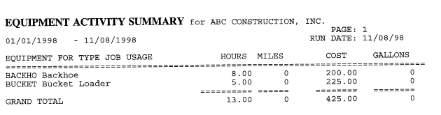 PRINT EQUIPMENT ACTIVITY BY TYPE