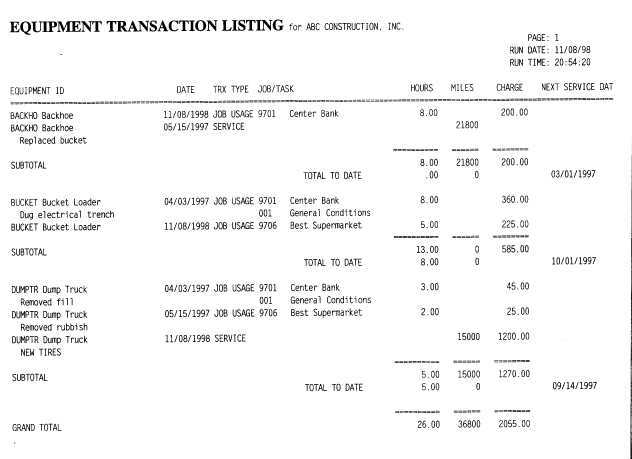 This report allows you to print equipment activity by any criteria stored in the equipment activity file.