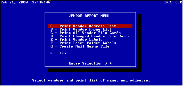 Vendor reports may be printed from both the Payables Report menu and the Company Files menu for convenience.