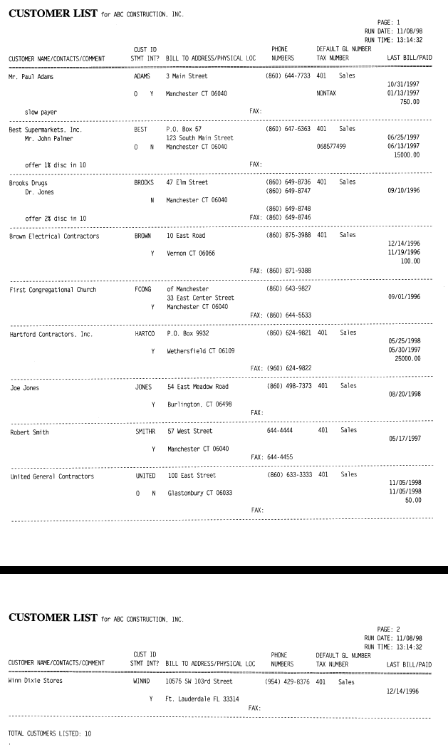 This report can be printed for customers selected by any criteria stored in the customer file and shows name and address information.