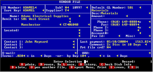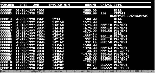 At the touch of a button you can view the entire history of a vendor showing all invoices, payments, credits and discounts. A more detailed history may also be printed.