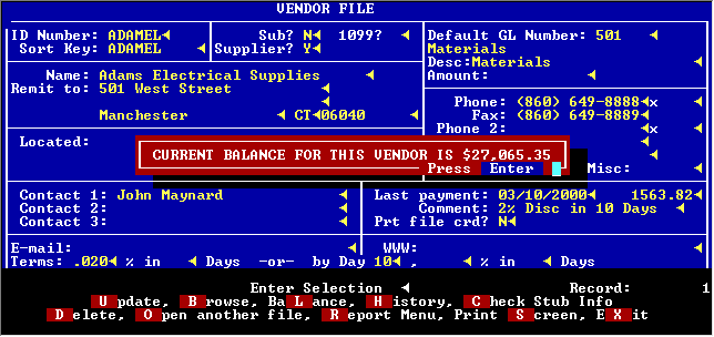 You can view or print a history of this vendor showing all invoices, payments and credits. You can also ask for a balance from this screen.