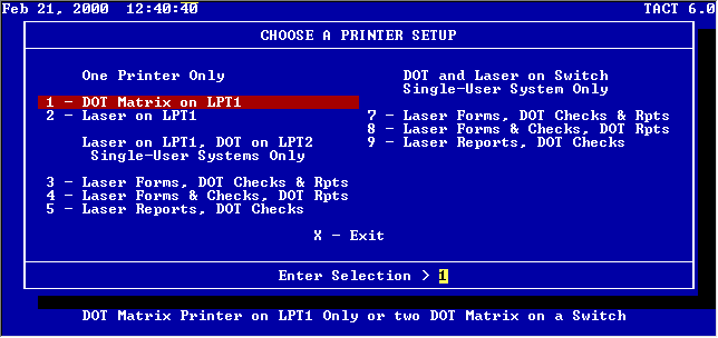TACT can handle many different print configurations. This screen shows the most common but other variations may be accomodated.