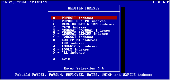 If there is a power failure or a system crash while you have a file open, you will need to rebuild indexes. This menu allows you to rebuild some or all indexes.