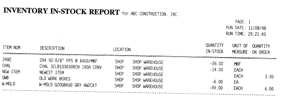This is a list of all items with the quantity in stock and on order shown.