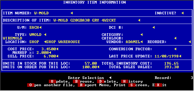 A conversion factor may be applied for items like lumber ordered by the piece but priced by thousand board feet. Cost is required. You may either enter a markup figure and have the system calculate the sales price or you may enter the sales price directly. History may be viewed or printed for any item. |