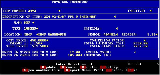 This selection is used after you have taken a physical inventory. You are presented with each item in each location in item number order. You simply enter the count you have and the system determines the adjustment to be made and creates an inventory activity record for that adjustment.