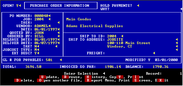 PO’s items can be shipped to your shop or to a jobsite. You may specify where in jobcost you wish the invoices for this PO to go (Materials, Subcontract, Service Equipment or Other). You may also specify the GL number to be used on the invoices.