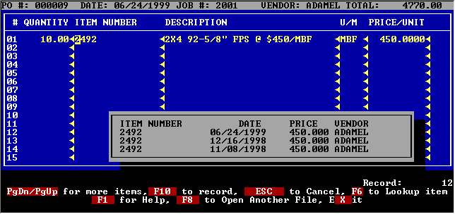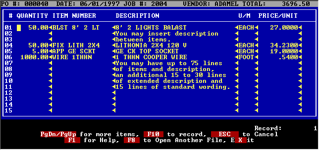 You may enter several screens of items. If you use an item number, the system will look up a price for you. You may simply enter a quantity, description and price if you do not wish to use a pricing data base. You can order by lot. You may also enter just description.