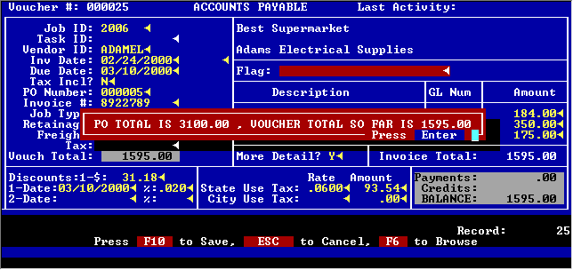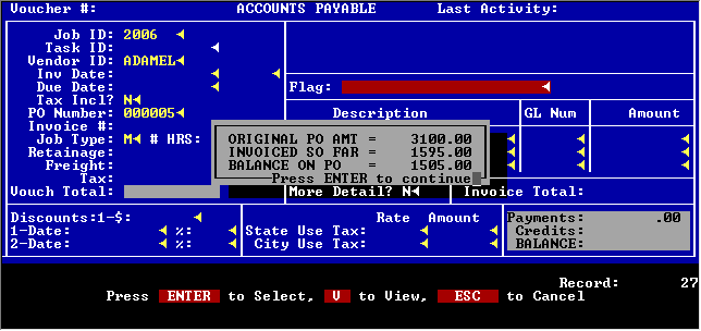 When entering a payable for a PO, the system immediately shows you where you stand on that PO.