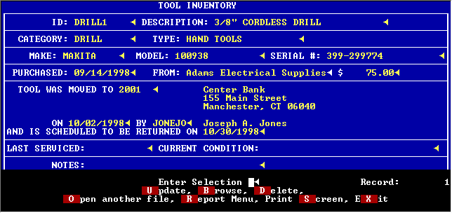 This screen is use to set up each tool and to tell the system where the tool currently is. You simply choose a location or job number to say where the tool is and then choose an employee that is responsible for its return. Enter a due date for the tool.